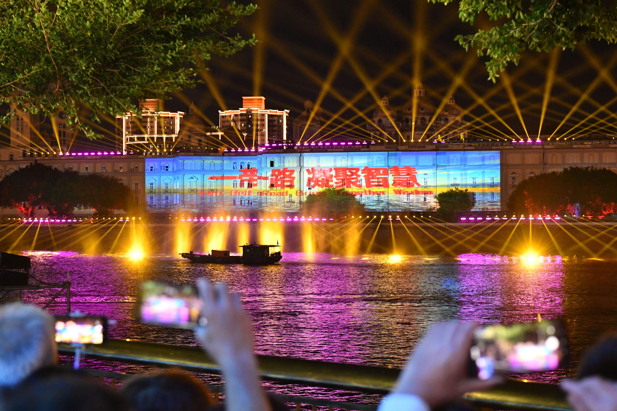 10月12日,福州闽江畔举行灯光秀庆祝2023世界航海装备大会开幕。 未经允许不得转载:城市新闻网i...