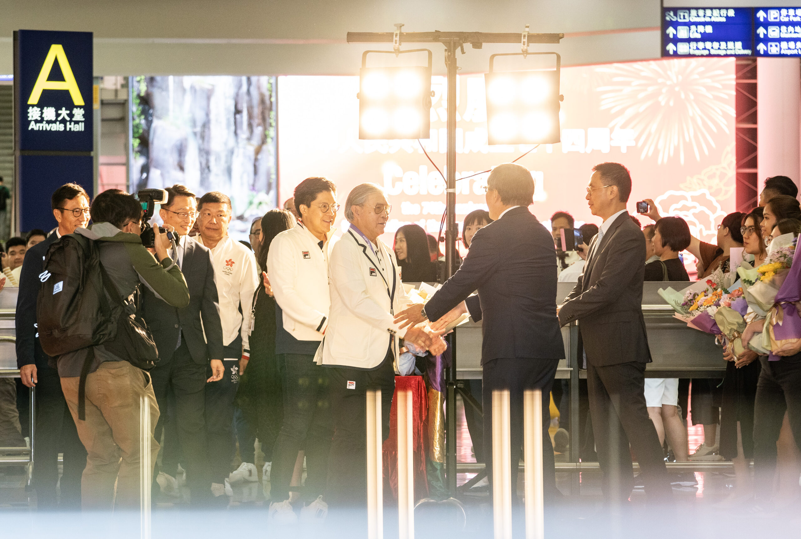 10月9日傍晚,参加杭州第19届亚运会的中国香港代表团官员及部分运动员载誉归来,抵达香港国际机场后参...