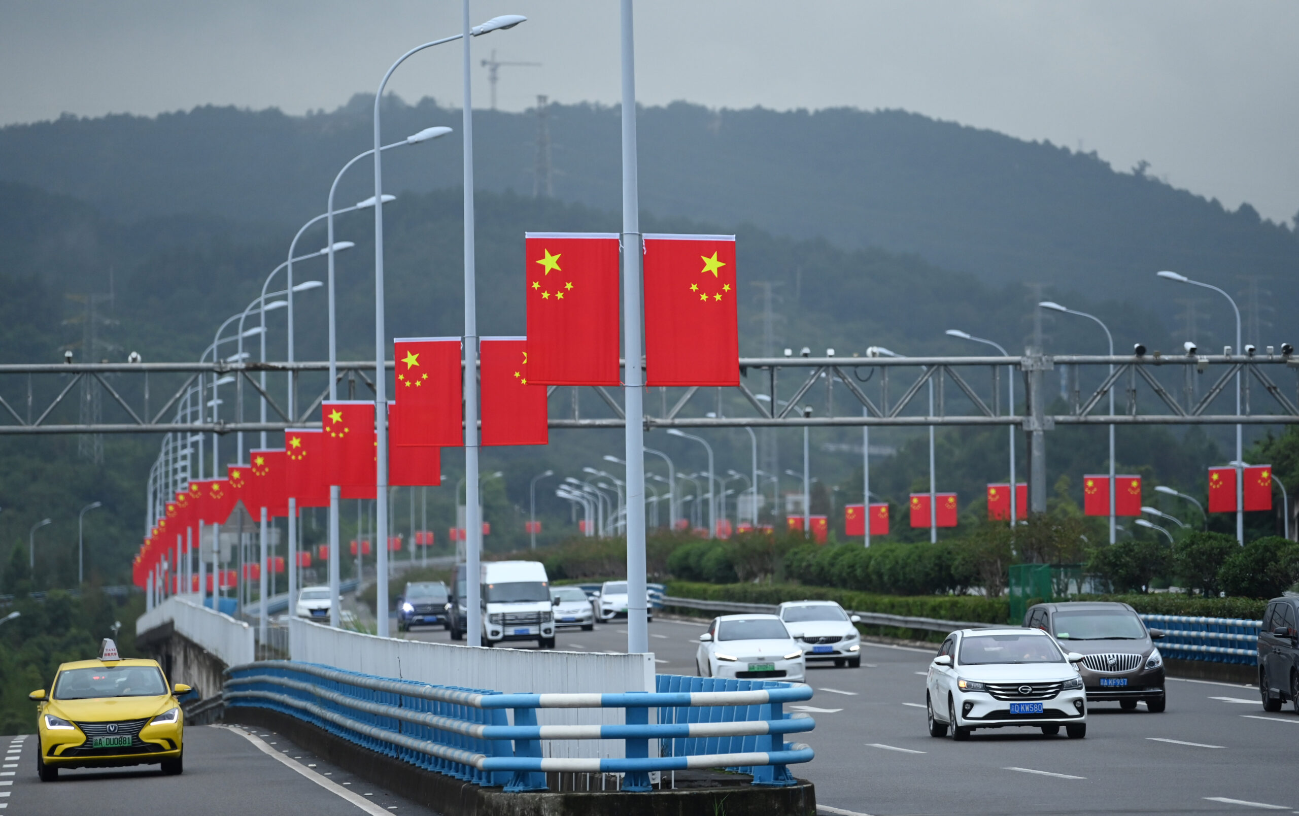 9月25日,国庆节将至,重庆主城区一道路两旁挂起了五星红旗,营造出浓浓的节日氛围. 未经允许不得转载...