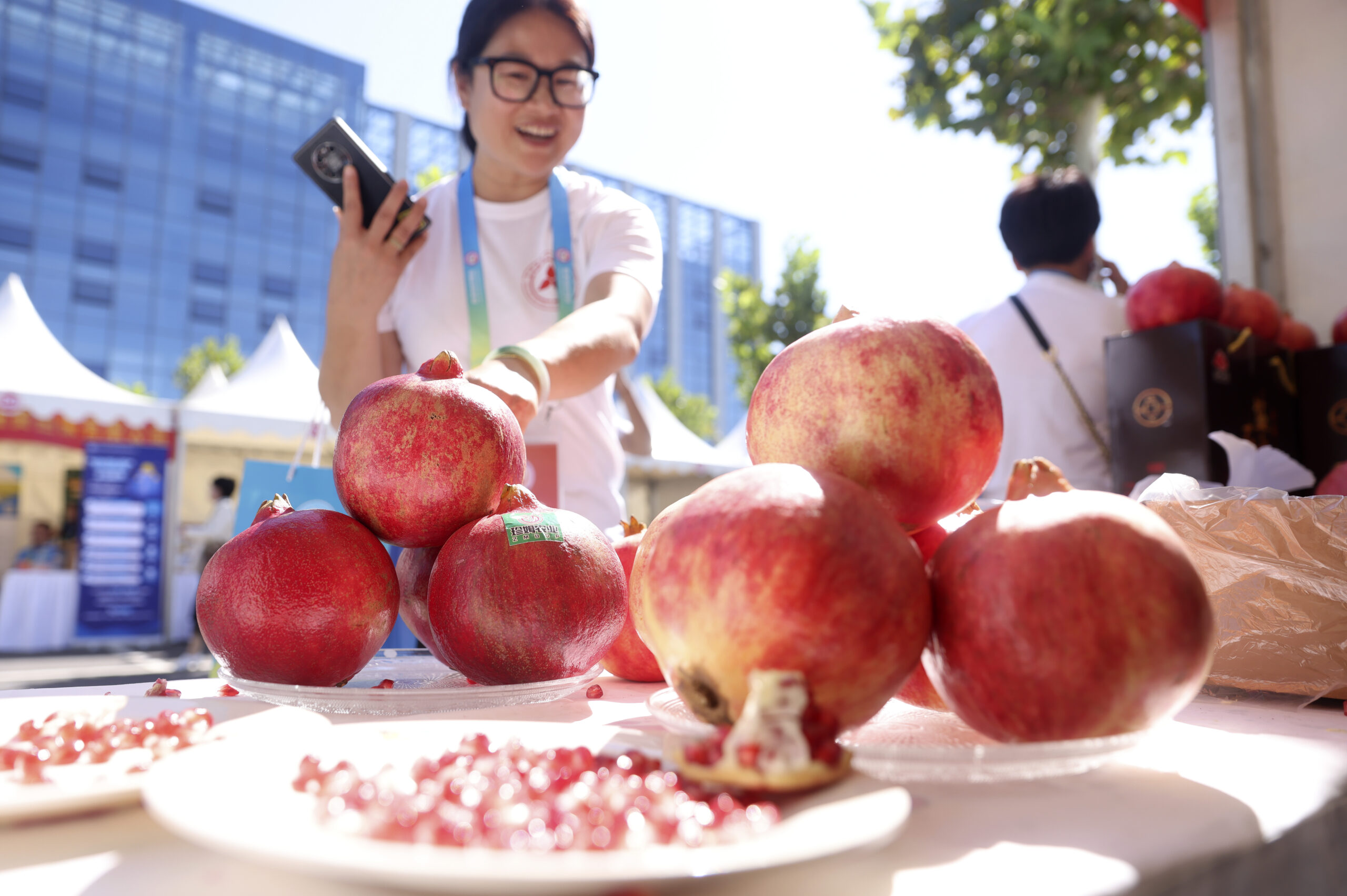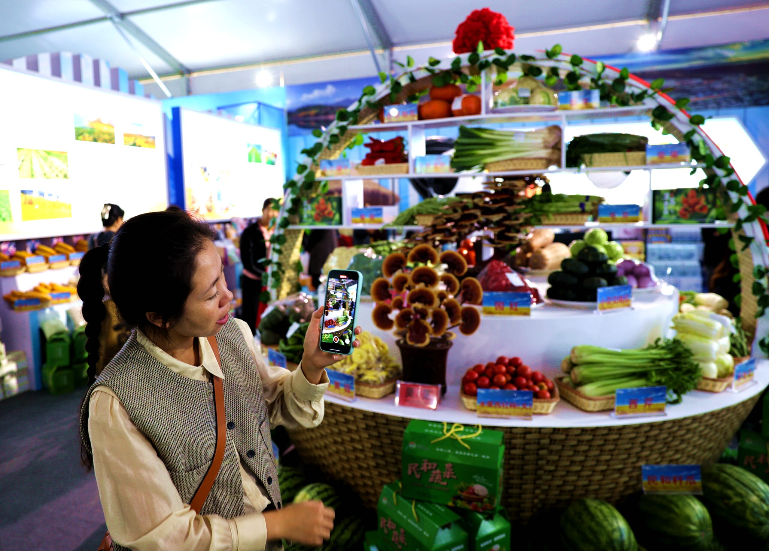 9月22日,青海省海东市民和回族土族自治县,参观者在展交会上拍摄各类农产品。当日,庆祝中国农民丰收节...