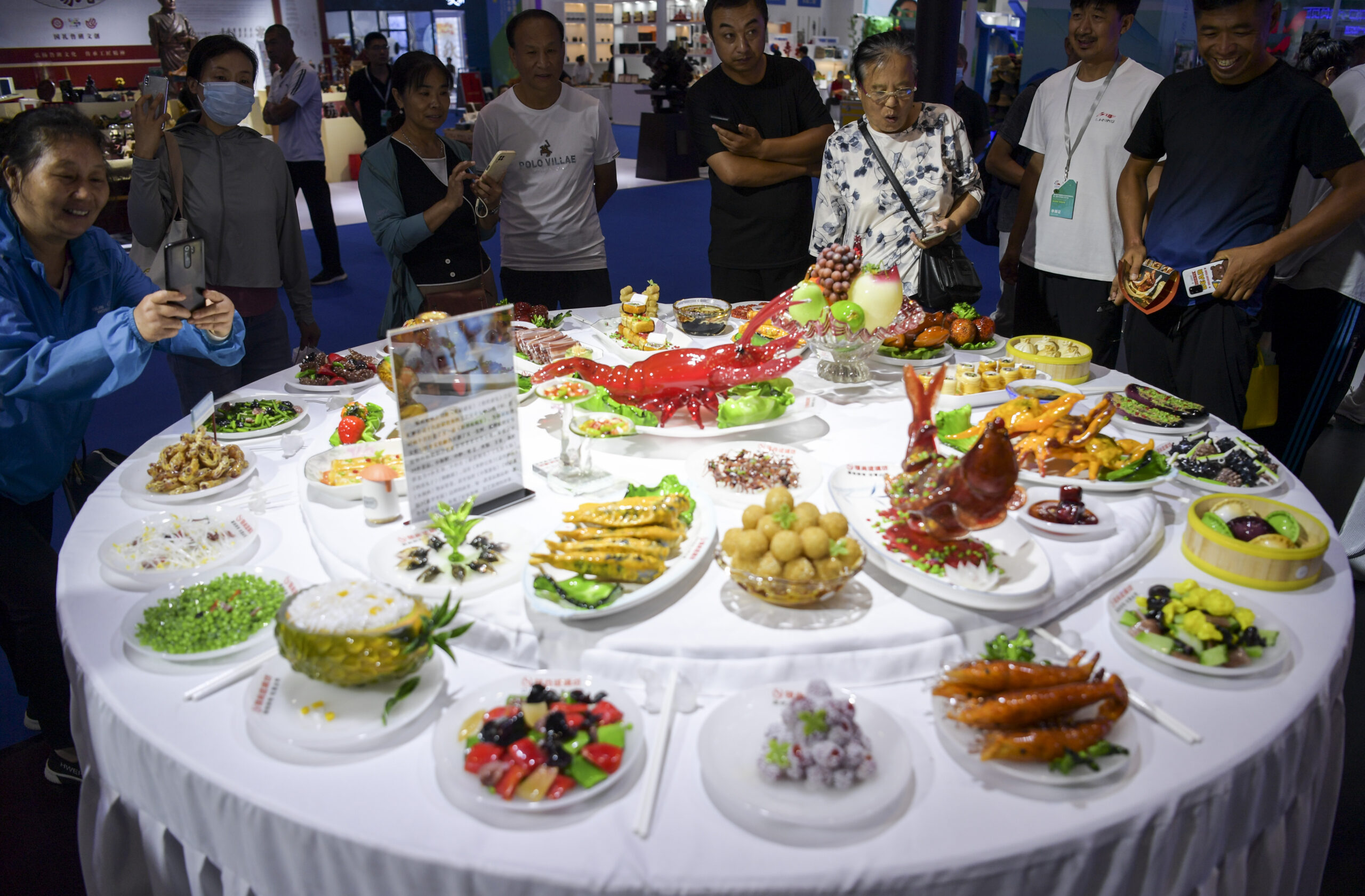 9月14日,参观者在展会上参观淄博“琉璃宴”。当日,第四届中国国际文化旅游博览会、第二届中华传统工艺...