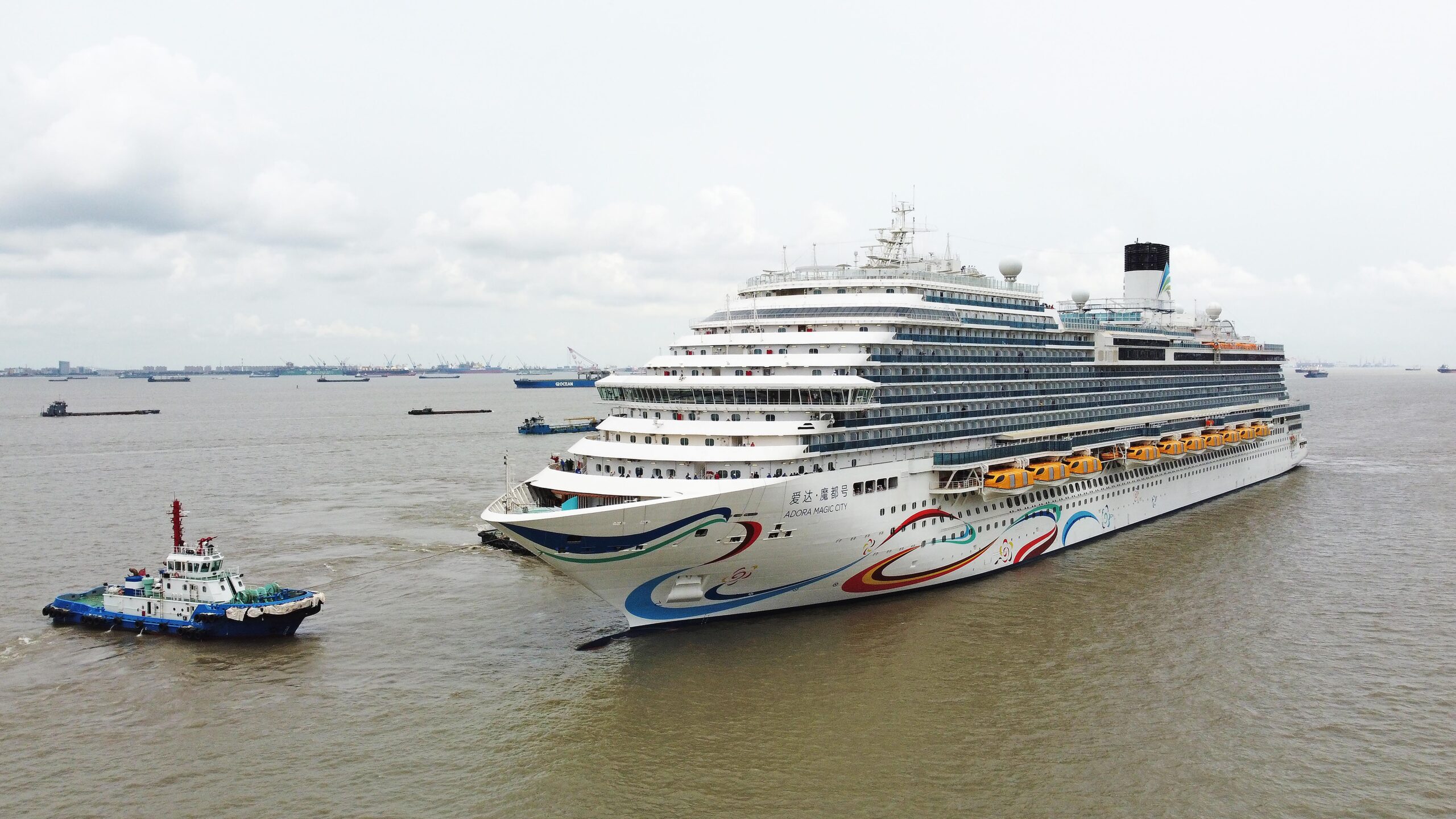 9月12日,中国首制大型邮轮“爱达·魔都号”在多艘拖轮的牵引下,稳稳地靠泊于中国船舶集团有限公司旗下...