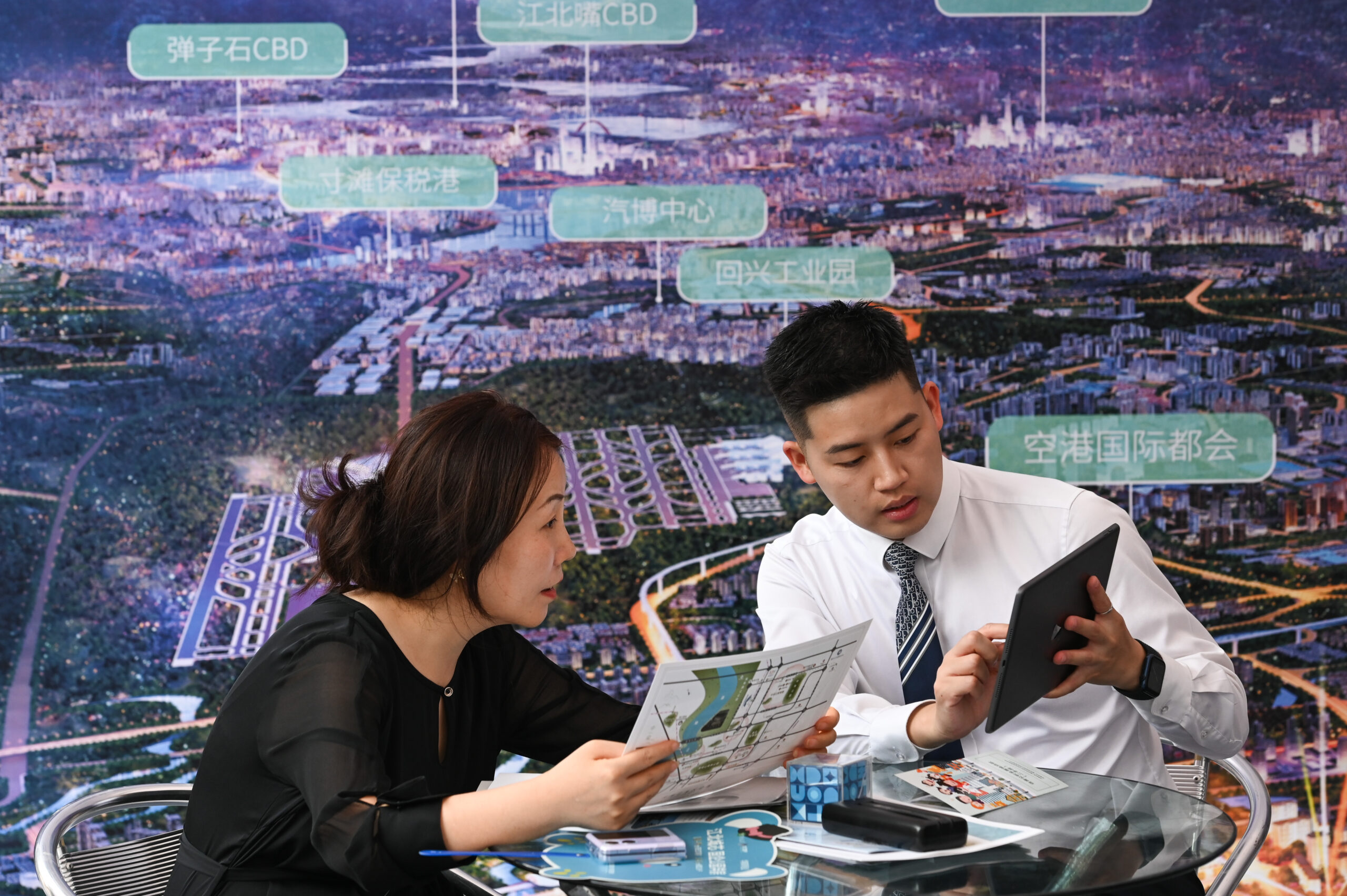 9月7日,重庆秋季房地产展示交易会现场,工作人员向市民介绍房屋信息。当日,2023重庆秋季房地产暨家...