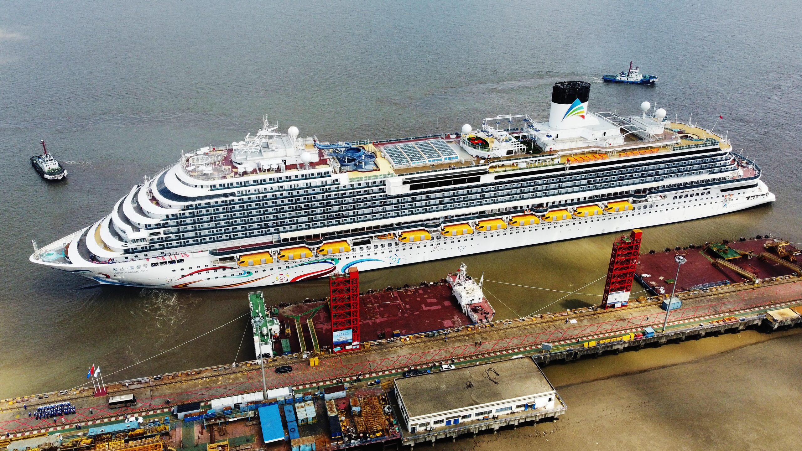 9月7日,首艘国产大型邮轮“爱达·魔都号”在拖船的牵引下,缓缓地驶离于中国船舶集团有限公司旗下外高桥...