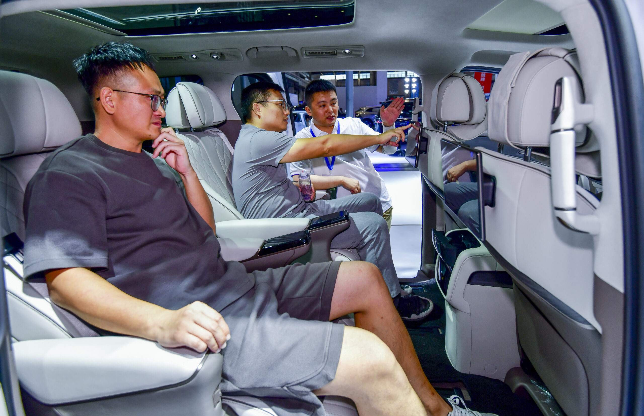 9月7日,海南海口,消费者在车展现场了解一款新能源商务车。当日,2023海南金秋车展暨智能网联新能源...