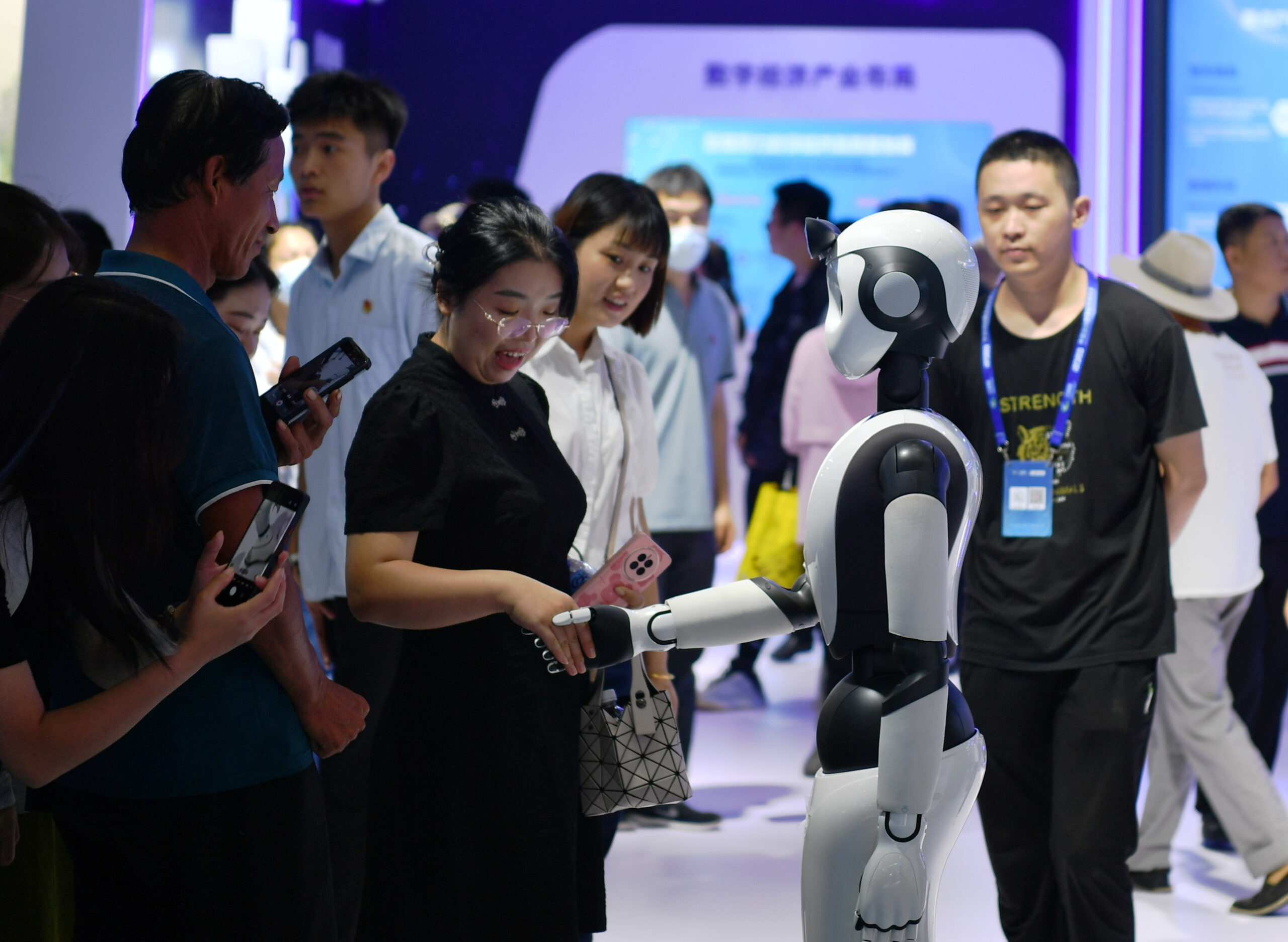 9月7日,参观者与智能机器人近距离互动。为期3天的2023中国国际数字经济博览会正在河北石家庄举行。...