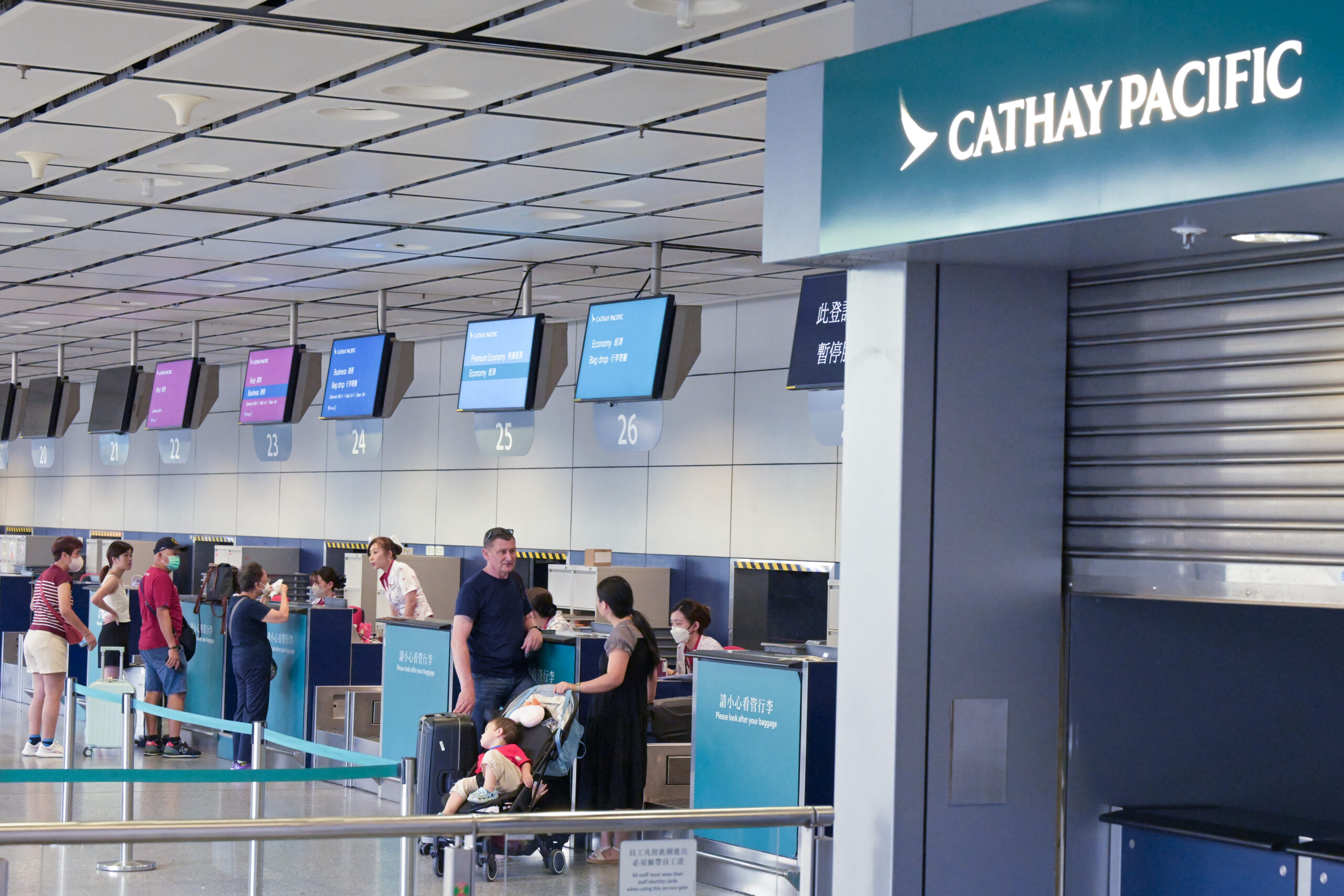 8月9日,国泰航空举行记者会公布,该公司2023年上半年盈利42.68亿港元。图为国泰航空员工为旅客...